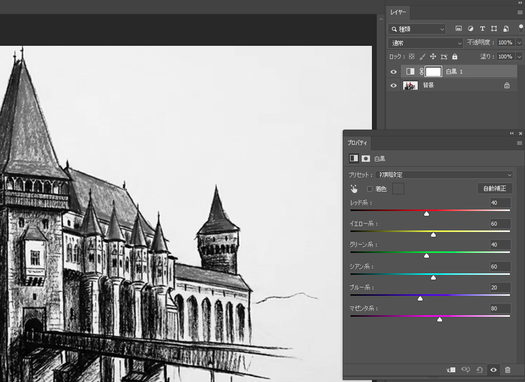 調整レイヤー白黒を作成すると6色のスライダーが出てきますので
