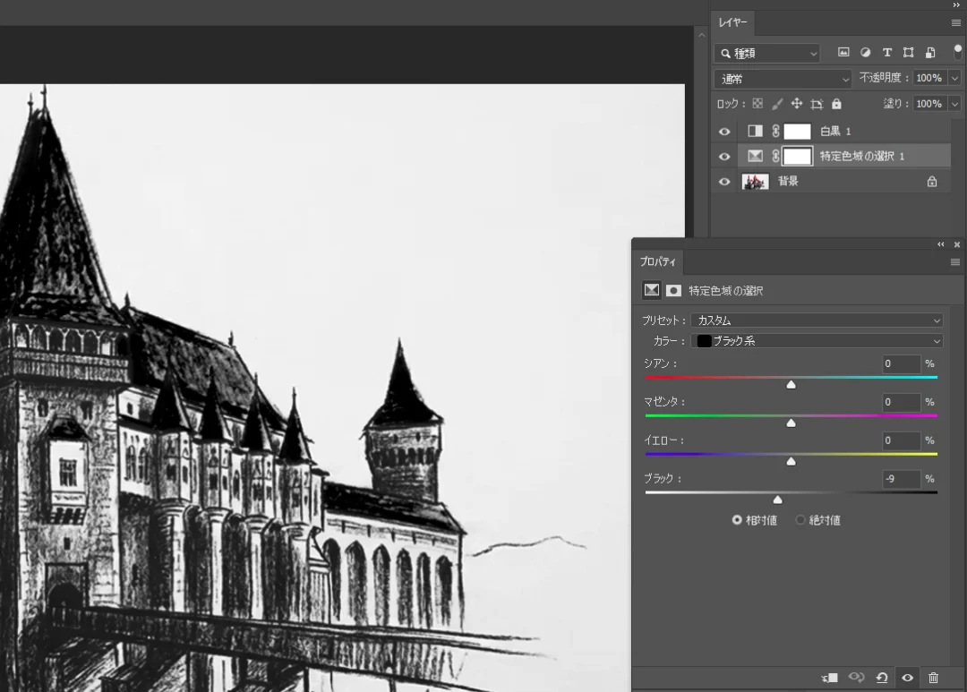 - もともとスミ調子だった部分と溶けてしまっているので特定色の選択の調整レイヤーを追加し、ブラック系の中のブラックのスライダーを左に動かしフラットになり過ぎないようにごくわずか明るく調整